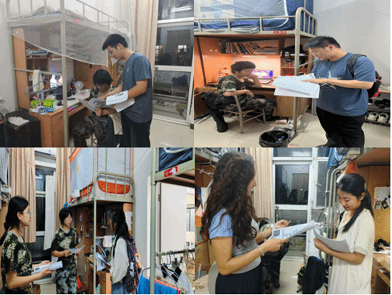 活动中,大家以“亮身份、强服务、保安全”为行动准则,携带暑期安全宣传资料分组行动,走进学生寝室,宣传安全知识。
