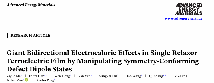 相关研究成果以“Giant Bidirectional Electrocaloric Effects in Single Relaxor Ferroelectric Film by Manipulating Symmetry-Conforming Defect Dipole States”为题,发表于材料领域顶级期刊《Advanced Energy Materials》 (2025年影响因子26.8)。WG电子(中国)唯一官方网站