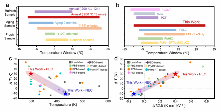 彭彪林教授团队在弛豫铁电薄膜中提出了“对称性匹配缺陷偶极态调控”新思路。通过调控缺陷偶极在不同热激活条件下的对称性匹配行为,使薄膜在不同温区呈现截然相反的电卡响应,从而在同一材料体系内实现了PEC与NEC的协同与可编程调控。该研究在(111)取向的PNNZT弛豫铁电薄膜中取得了显著的电卡温变结果: ,并展示了温区可调的双向电卡能力,为发展硅基兼容的高效固态制冷技术提供了新途径。该研究将“缺陷偶极的对称性匹配状态”作为一个可设计与调控的关键自由度,在弛豫铁电薄膜中实现了巨幅双向电卡效应与温区可编程性能,为面向芯片级热管理的高效固态制冷材料与器件设计提供了新的通用策略。
