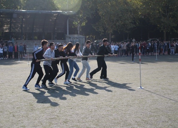对手是势均力敌的微电子院。你方力拔山兮,我方寸土不让。战况灼人,围观的同学与老师齐声呐喊,紧攥拳头为我们材料学子加油助威!虽最后一刻惜败,但那一刻齐力断金的场景深深烙印在我们每一位同学的记忆里。在50米绑腿同行的比赛中,训练有素的同学们喊着号子,整齐划一迈着步子向终点冲去,在中场部分队伍出现了一些状况,有些同学脚步出现了错乱更是波及一片,这时远远听到刘男老师焦急的声音,体育委员迅速冲上去,你抱我挪,同学们互相助力最终到达了终点。这个项目WG电子