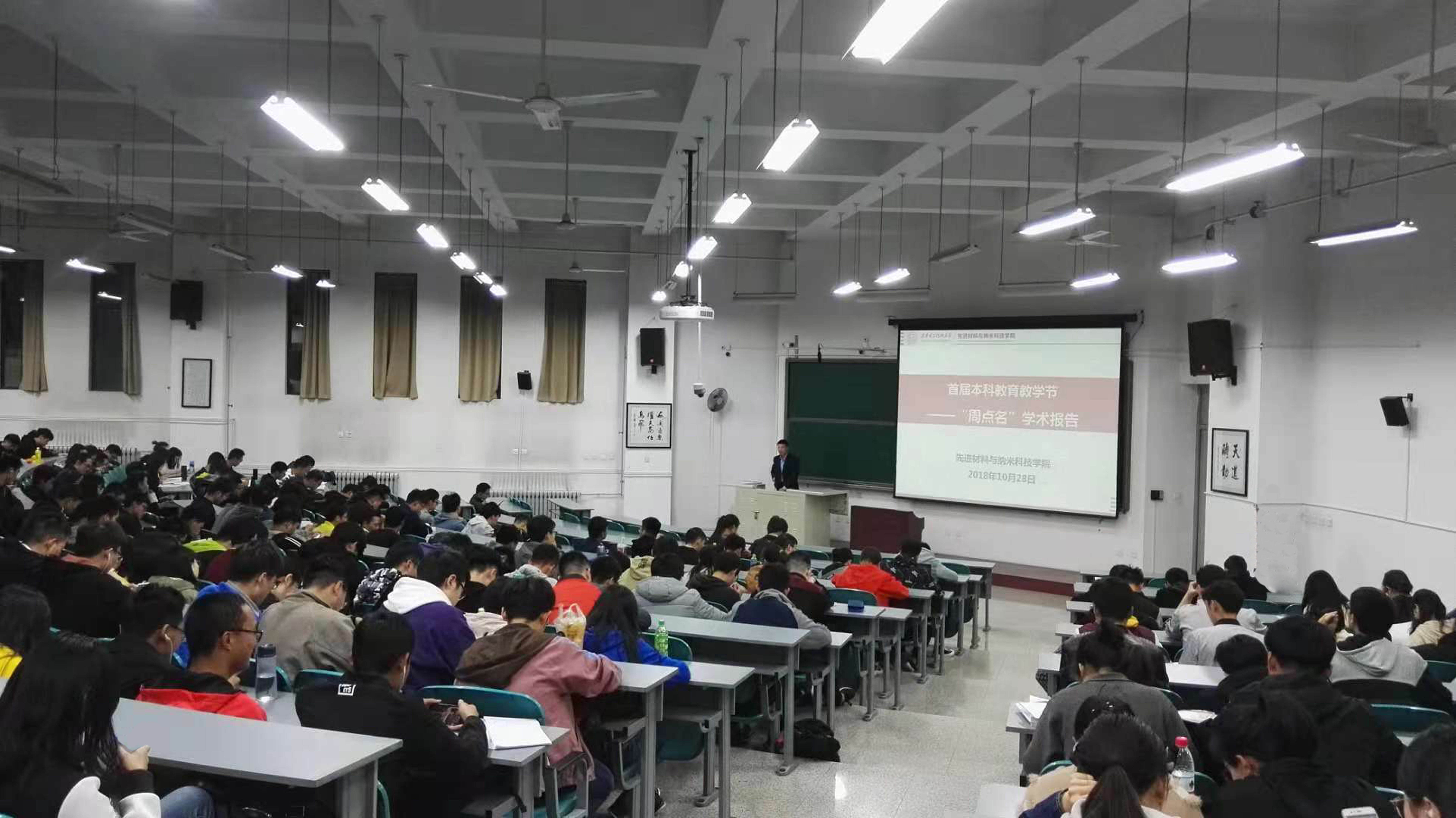 研究领域等内容,勉励青年学子们关注自身健康,积极进取不断探索勇攀材料科学高峰。与以往各年级单独开展“周点名”教育活动不同,本次活动以全新的形式将学生日常教育管理中的“周点名”活动同“名师导航”讲座报告相结合,充分利用了学生时间,强化了名师的引领作用,有利于培养学生专业认同感;同时,全院本科生共聚一堂,增进了各年级之间的交流,有利于培养学生集体荣誉感。