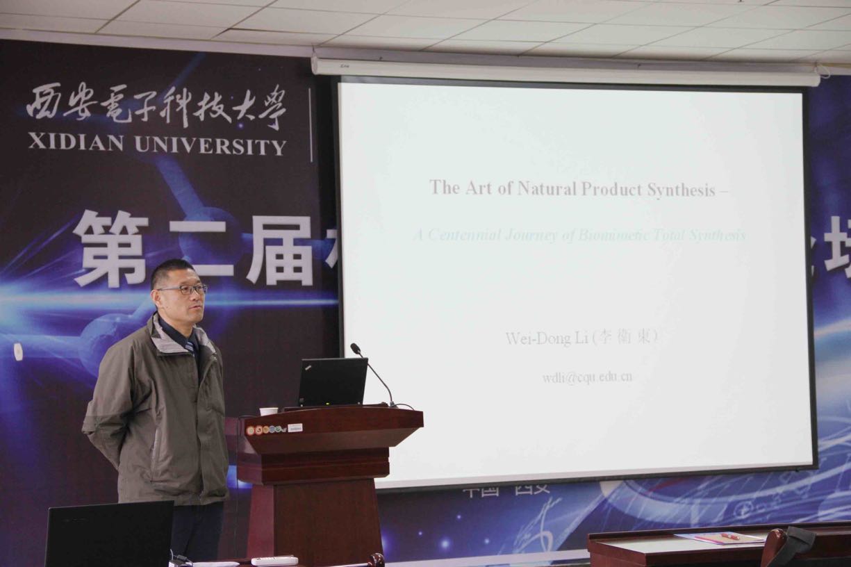报告会于上午10:30分正式开始。首先,李卫东教授从有机合成的发展历史和仿生有机合成的研究背景,列举了经典的有机合成成果,如Robinson Synthesis of Tropinone (1917年),Barton Synthesis of Strychnine (1954年),Corey Synthesis of Antheliolide A (2006年)等。随后,李教授介绍了自己科研团队的研究内容及成果,分析了有机仿生合成未来发展的方向和面临的挑战。报告结束后,李卫东教授同在场师生进行了深入的互动交流。李卫东教授的研究方向为传统的有机全合成,在报告中,为了更贴近WG电子