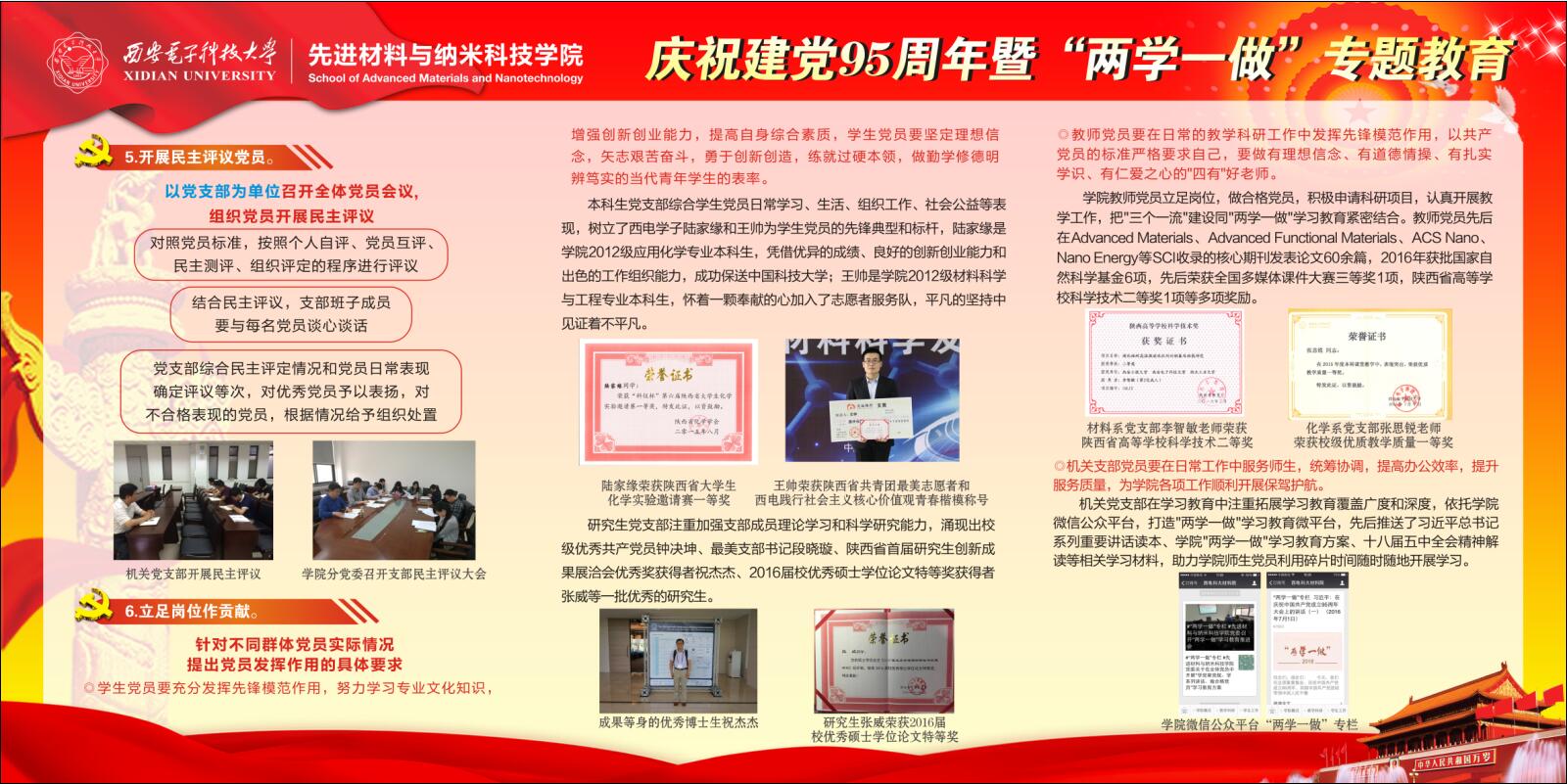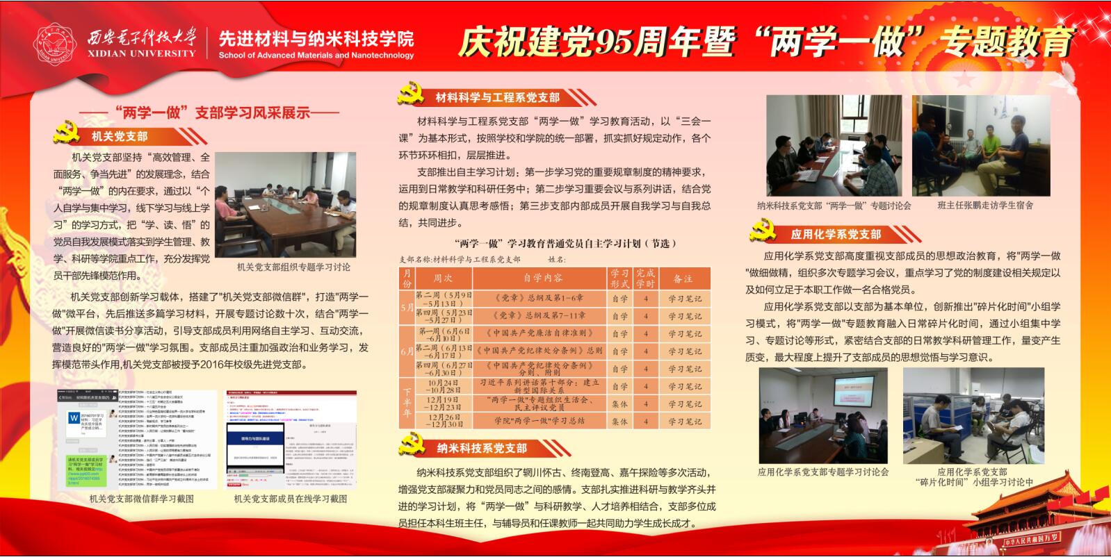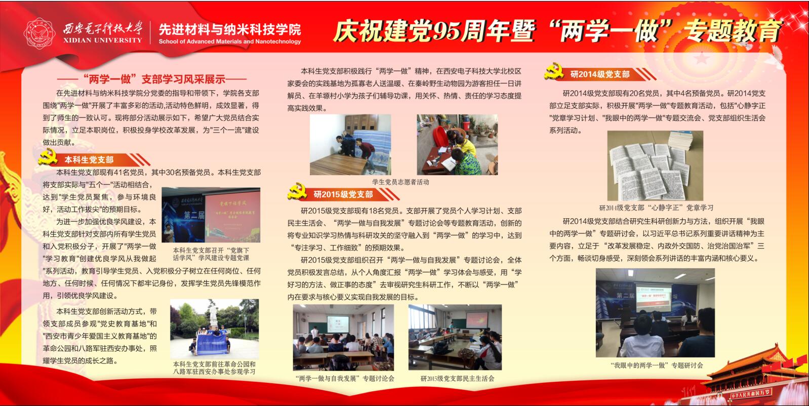 (通讯员 钟决坤 卢琳)为落实“两学一做”学习教育精神,充分发挥党员先锋模范作用,浓郁WG电子 学习氛围,2016年9月,WG电子 在G楼一层大厅WG电子 文化展示区推出庆祝建党95周年暨“两学一做”教育专题展示。 WG电子 积极开展“学党章党规、学系列讲话,做合格党员”学习教育活动,在WG电子 分党委的指导和带领下,各支部以“两学一做”为中心开展了丰富多彩的学习教育活动,特色鲜明,成效显著。本次展示主要以展板的形式体现,紧紧围绕“两学一做”的核心教育内容、WG电子 学习教育方案、各支部创意活动等内容,采用文字、图片和图表相结合的方式,全面、凝练且清晰的展示了“如何学、怎么做”,WG电子 特色教育活动以及各支部将“两学一做”融入学习、教学、科研、管理等方面的风采。希望广大党员结合实际情况,立足本职岗位,积极投身学校改革发展,为“三个一流”建设做出贡献。(完)