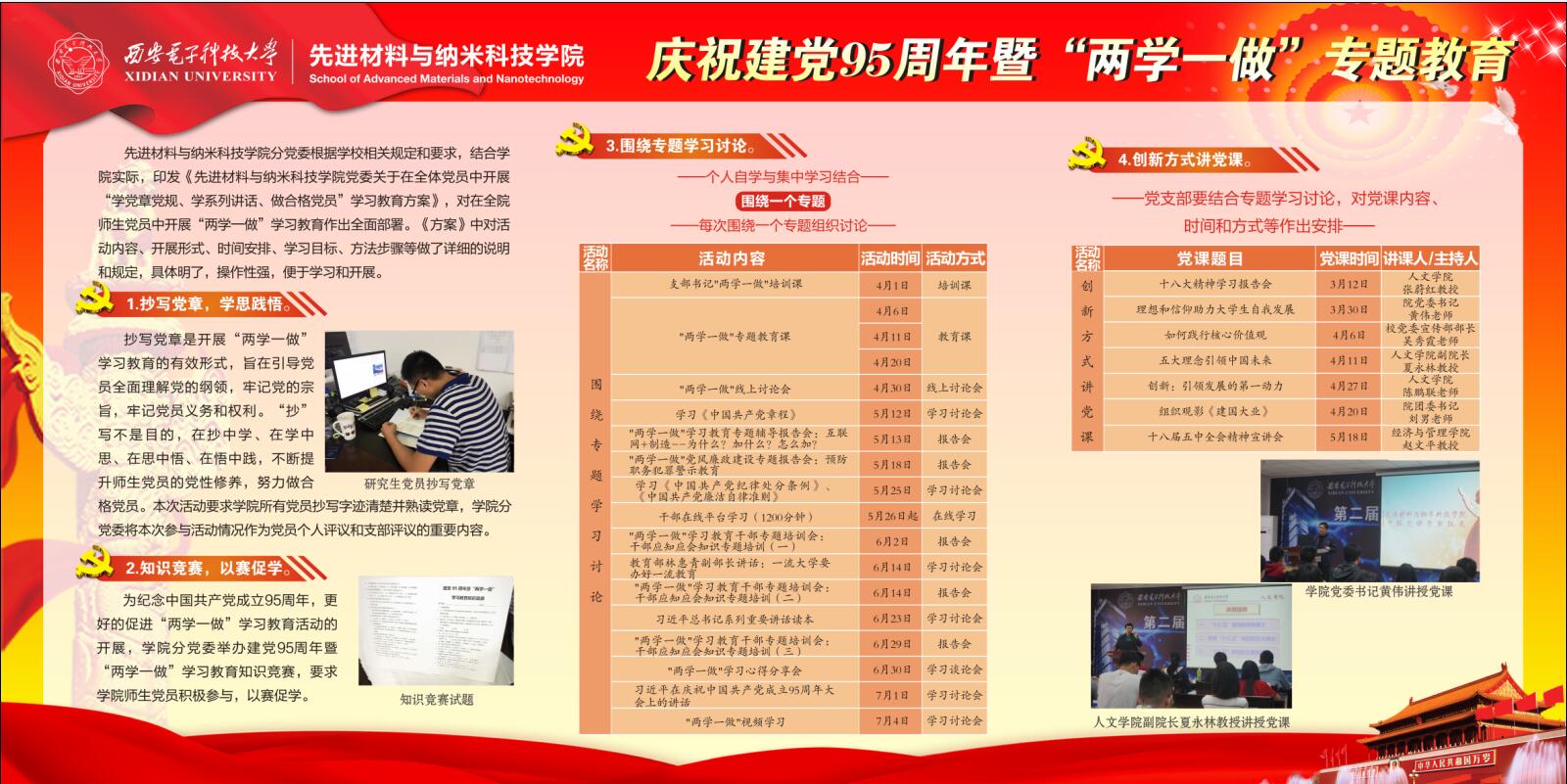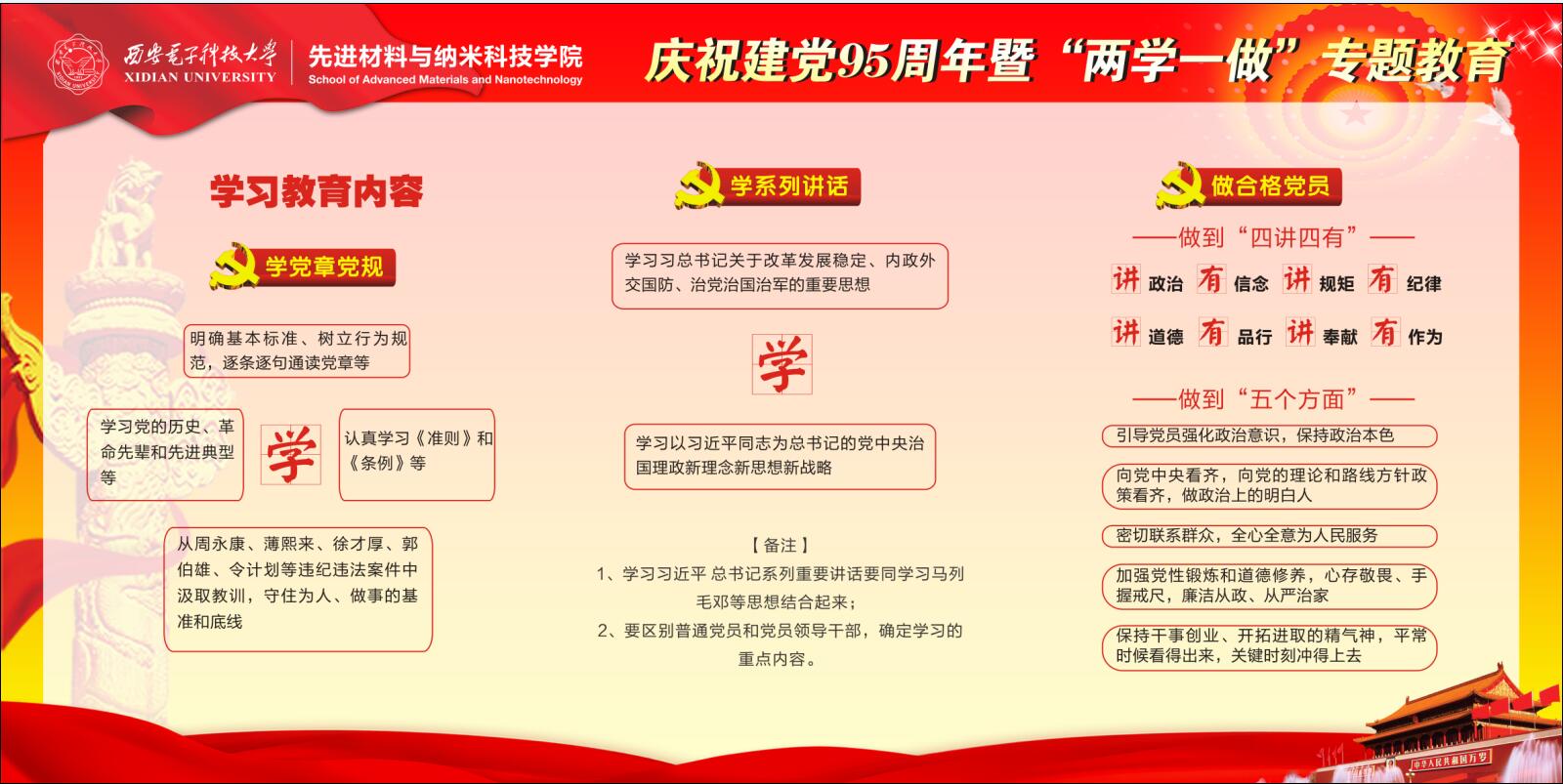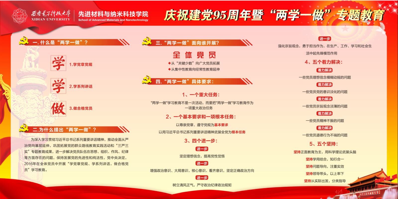 (通讯员 钟决坤 卢琳)为落实“两学一做”学习教育精神,充分发挥党员先锋模范作用,浓郁WG电子 学习氛围,2016年9月,WG电子 在G楼一层大厅WG电子 文化展示区推出庆祝建党95周年暨“两学一做”教育专题展示。 WG电子 积极开展“学党章党规、学系列讲话,做合格党员”学习教育活动,在WG电子 分党委的指导和带领下,各支部以“两学一做”为中心开展了丰富多彩的学习教育活动,特色鲜明,成效显著。本次展示主要以展板的形式体现,紧紧围绕“两学一做”的核心教育内容、WG电子 学习教育方案、各支部创意活动等内容,采用文字、图片和图表相结合的方式,全面、凝练且清晰的展示了“如何学、怎么做”,WG电子 特色教育活动以及各支部将“两学一做”融入学习、教学、科研、管理等方面的风采。希望广大党员结合实际情况,立足本职岗位,积极投身学校改革发展,为“三个一流”建设做出贡献。(完)