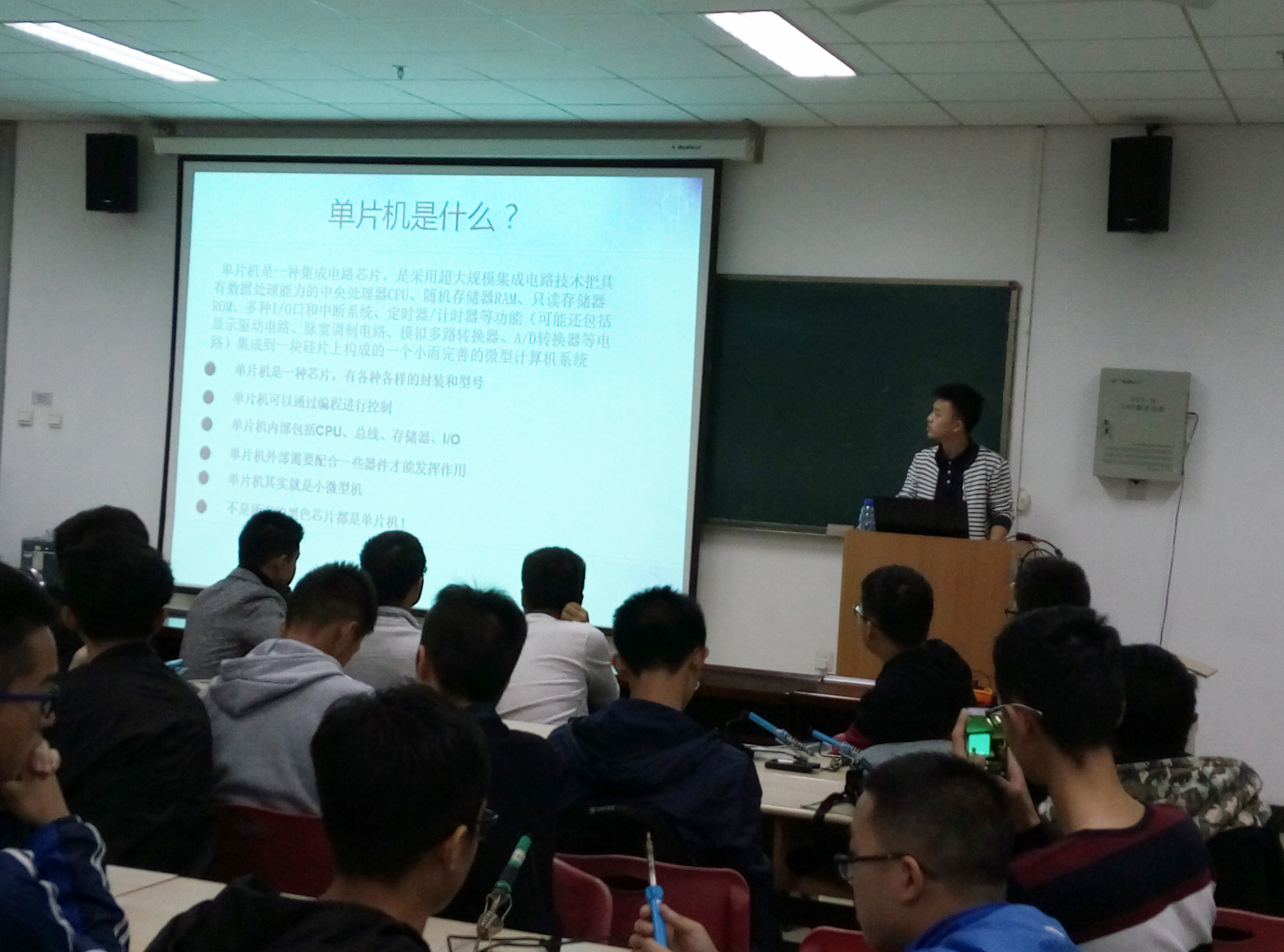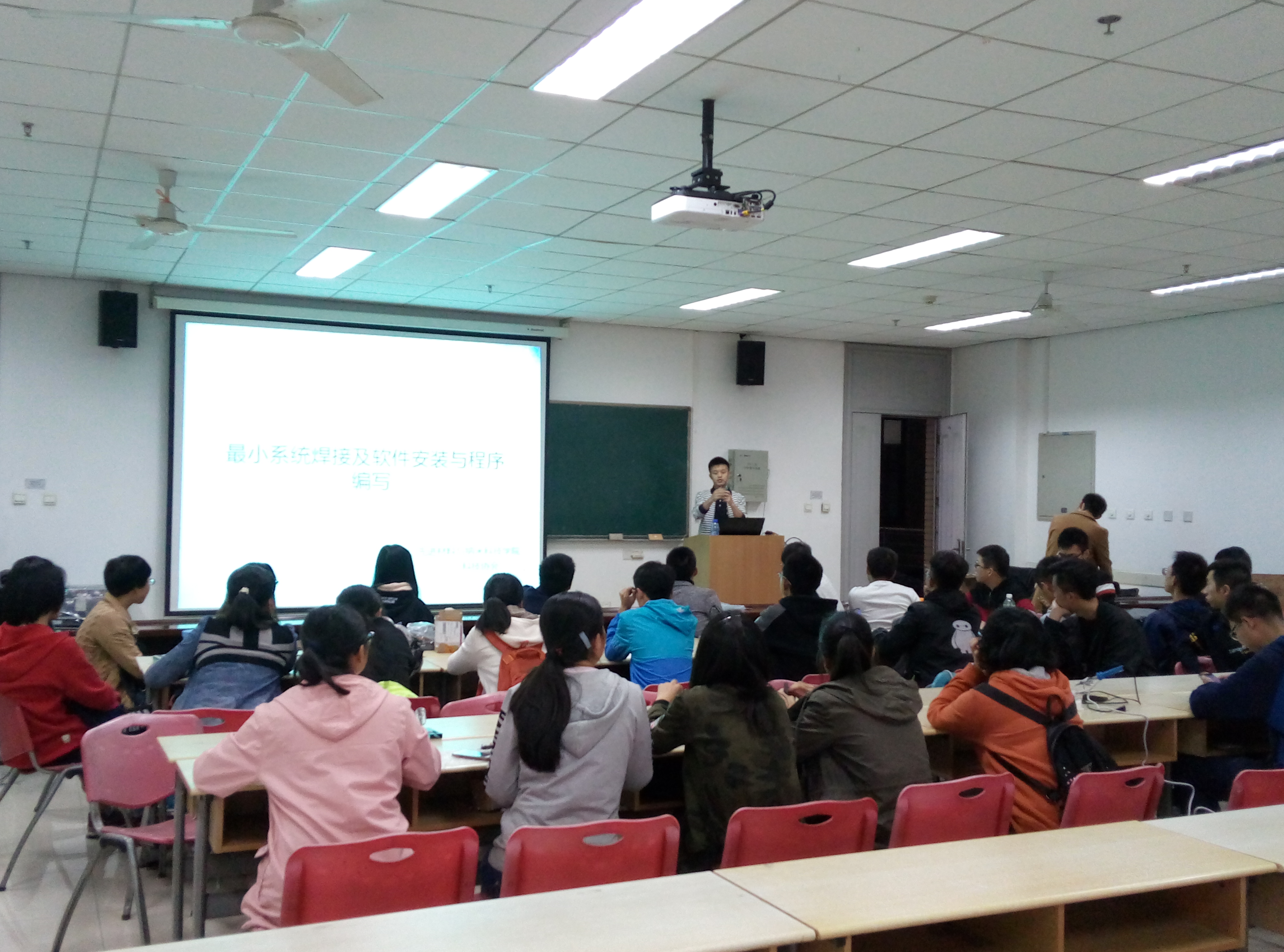 首先,杨浩大致讲解了单片机的基本构成与主要功能,介绍了有关单片机编程方面的注意事项,并在随后现场进行了流水灯的编程演示,传授了如何将编译好的程序烧入单片机内。耐心的讲解令新生们熟悉了单片机的基本原理与功能,消除了新生们对于如何操作单片机的疑惑,起到了很好的培训效果。之后,由王杰指导新生进行单片机的焊接培训,王杰多次上台讲解关于器件的使用和不同元件的焊接位置等问题,并在潜移默化中引导大家使用多用电表测量电阻以方便检测焊接的正确与否。讲解后同学们兴致勃勃地进行了单片机电路的焊接,这期间王杰也对同学们焊接过程中出现的种种错误进行了指正,最后同学们用自己焊接的单片机进行了程序烧录试验,都取得了成功。