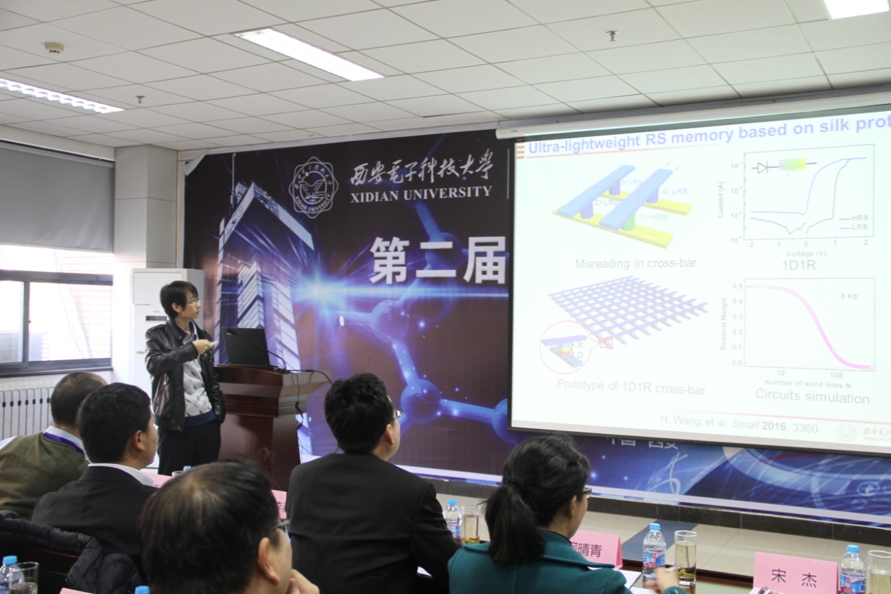 王宏副教授带来了题为《Degradable Resistive Switching Memory Devices》的精彩报告。他针对目前传统电子产品对于环境的严重污染问题,强调了瞬态电子器件概念的提出旨在电子器件在结束使用后,可绿色降解,最终实现环境保护的目的。由于蚕丝蛋白材料是生物兼容、可降解,而且具有独特的电学性能,王宏将此类材料研究应用于阻变存储器、阈值开光以及柔性器件方面的应用。基于蚕丝蛋白的电子器件,可通过调控电压,实现不同功能之间的相互转化。该类型器件还具有轻薄型、可穿戴性、人体可吸收的特点,在未来具有巨大的应用前景。