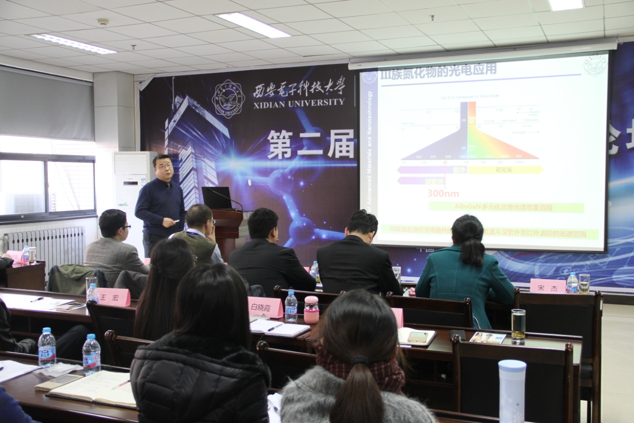 的优秀教师也与参会师生分享了他们的科研工作和成果。李培咸教授作了题为《氮化物半导体器件材料技术》的大会报告。他指出,紫外LED高的光子能量需要高Al组份的AlGaN材料作为基础材料,同时需要高的p型掺杂提供足够的空穴形成复合发光。其中,高质量、低缺陷AlGaN材料生长和p型掺杂是世界难题。他提出的表面反应增强脉冲式生长方法,可以实现了不同反应物质的分时输运,从而大幅降低气相预反应,最终得到的材料指标具有国际领先水平。针对紫外LED整体结构中复杂应力的问题,李培咸提出基于脉冲生长方法的超晶格应力掺杂调制结构,可极大地提升器件发光效率和器件抗静电能力。对于该法所得的低缺陷密度AlGaN材料势垒层,其载流子限域效应得到提高,从而实现高的紫外功率和低的反向漏电。