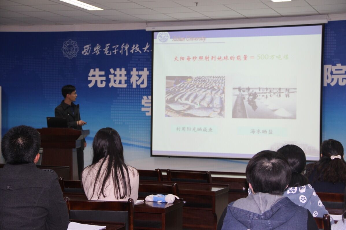 青年教师仲鹏博士主讲。他首先讲述了太阳能电池的发展已经经过了漫长发展历史,先后经历了以单晶硅材料为代表的第一代太阳能电池和以薄膜半导体材料为代表的第二代太阳能电池。为了进一步克服前两代太阳能电池存在的弱点,不断提高电池的光电性能及转换效率,诞生了第三代太阳能电池。其次,讲述了第三代电池的种类、优点和应用领域。重点讲述了染料敏化太阳能和钙钛矿太阳能电池的结构构成和工作原理。并介绍了自己课题组的研究成果和方向。第三代太阳能光伏电池综合了第一、二代太阳能电池的优点,克服了第一代太阳能电池成本较高、第二代薄膜太阳能电池转换效率低的不足,并且具有原材料丰富、无毒、性能稳定耐用、对环境无危害等优点,应用领域非常广泛。其应用已从军事领域、航天领域进入工业、商业、农业、通信、家用电器以及公用设施等部门,尤其可以分散地在边远地区、高山、沙漠、海岛和农村使用,以节省造价很贵的输电线路。最后,指出了第三代太阳能电池的当前应用瓶颈。目前第三代太阳能电池限于实验室研究,它的成本还很高,稳定性不够,因此大规模使用仍然受到限制,仍需大量研究深入探索。