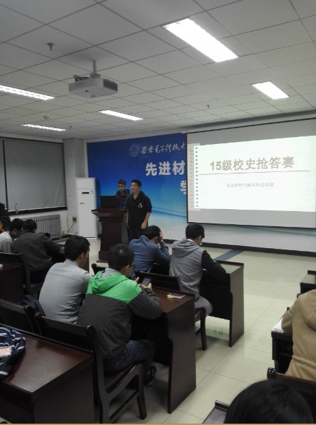 此次活动由班长胡永刚与孙丹宁主持,校史知识抢答赛总共分为六大部分:历史沿革、校风宗旨、学科建设、学术成就、校友领导和新生祝语。前五个部分均为校史知识问答,在此过程中,同学们参与积极,抢答氛围热烈,场面紧张而有序。最终产生三名优胜组,并颁发奖品。最后,每位同学将自己对学校的美好期望写下,贴成“西电”字样并合影留念。