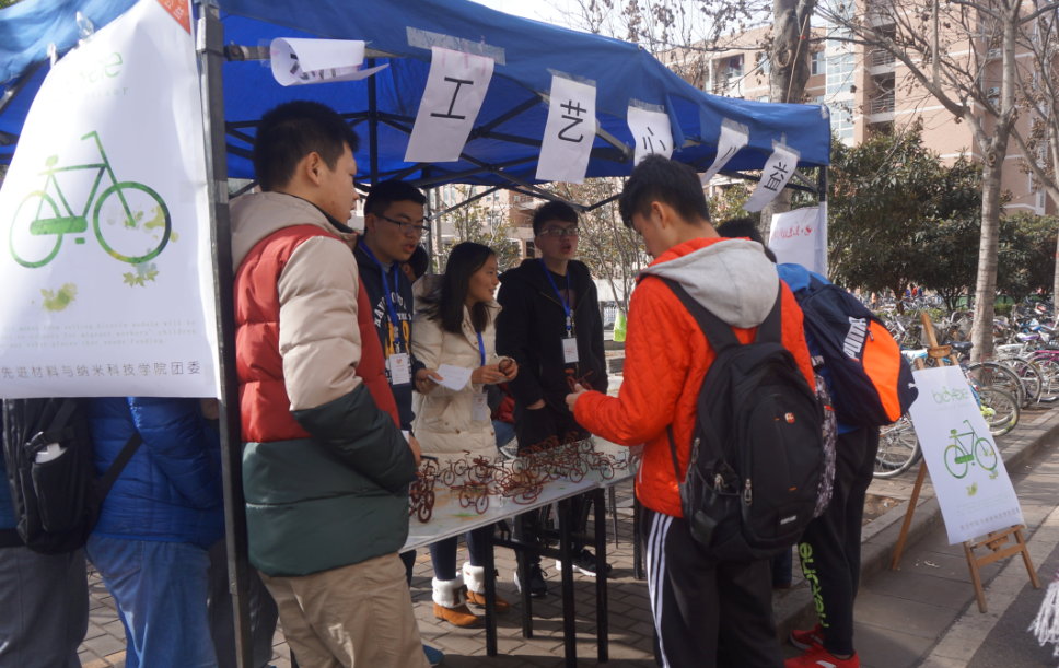 团委于丁香餐厅南门外举行了“手工艺,心公益”微自行车义卖活动。本次活动由团委志愿者队和设计中心联合开展,团委各部门成员也积极参与宣传,为义卖贡献自己的力量。