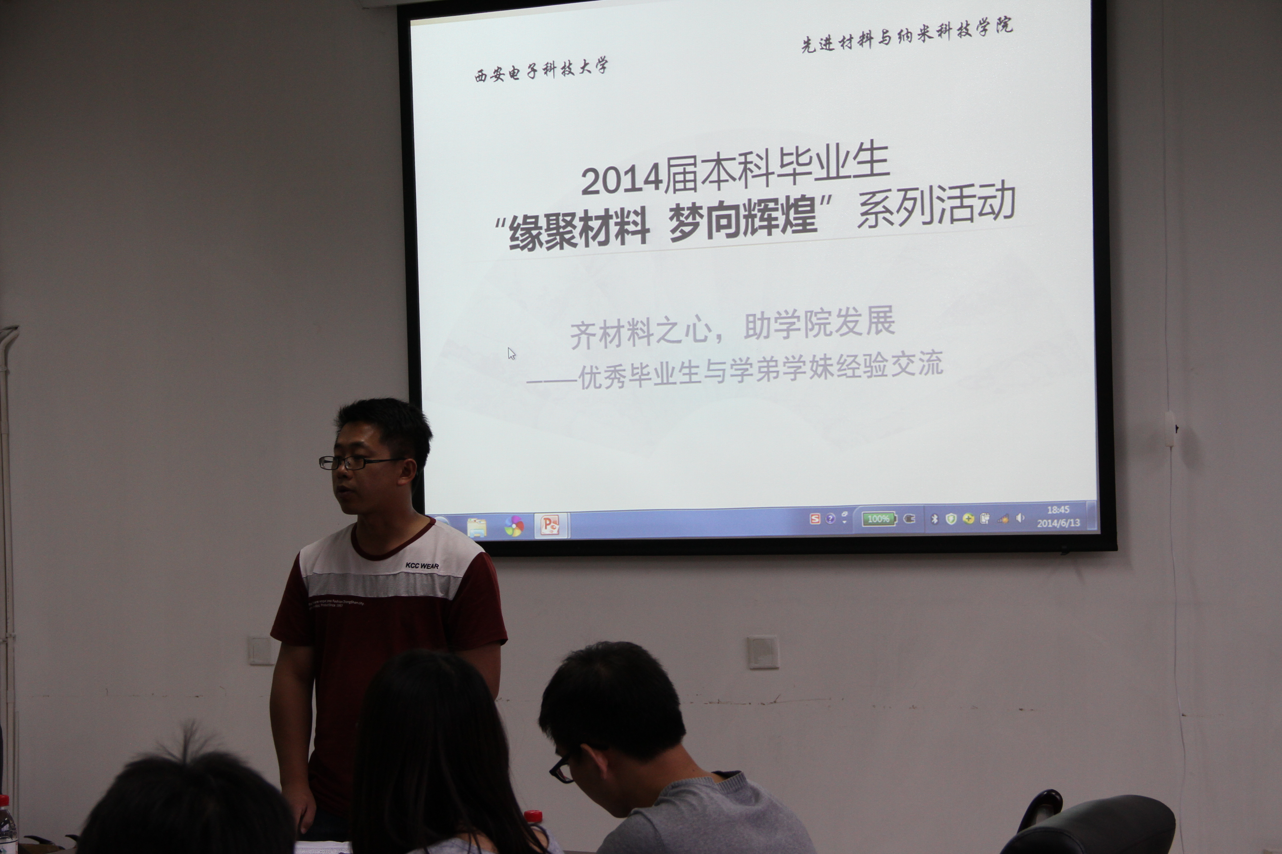 交流会的最后,10级辅导员马维红老师感谢了五位毕业生的经验分享,向他们赠送了纪念品,并向大一、大二同学介绍了毕业生开展的“缘聚材料 梦向辉煌”毕业季系列活动内容,希望低年级同学能积极关注和支持此系列活动的开展,同时鼓励WG电子