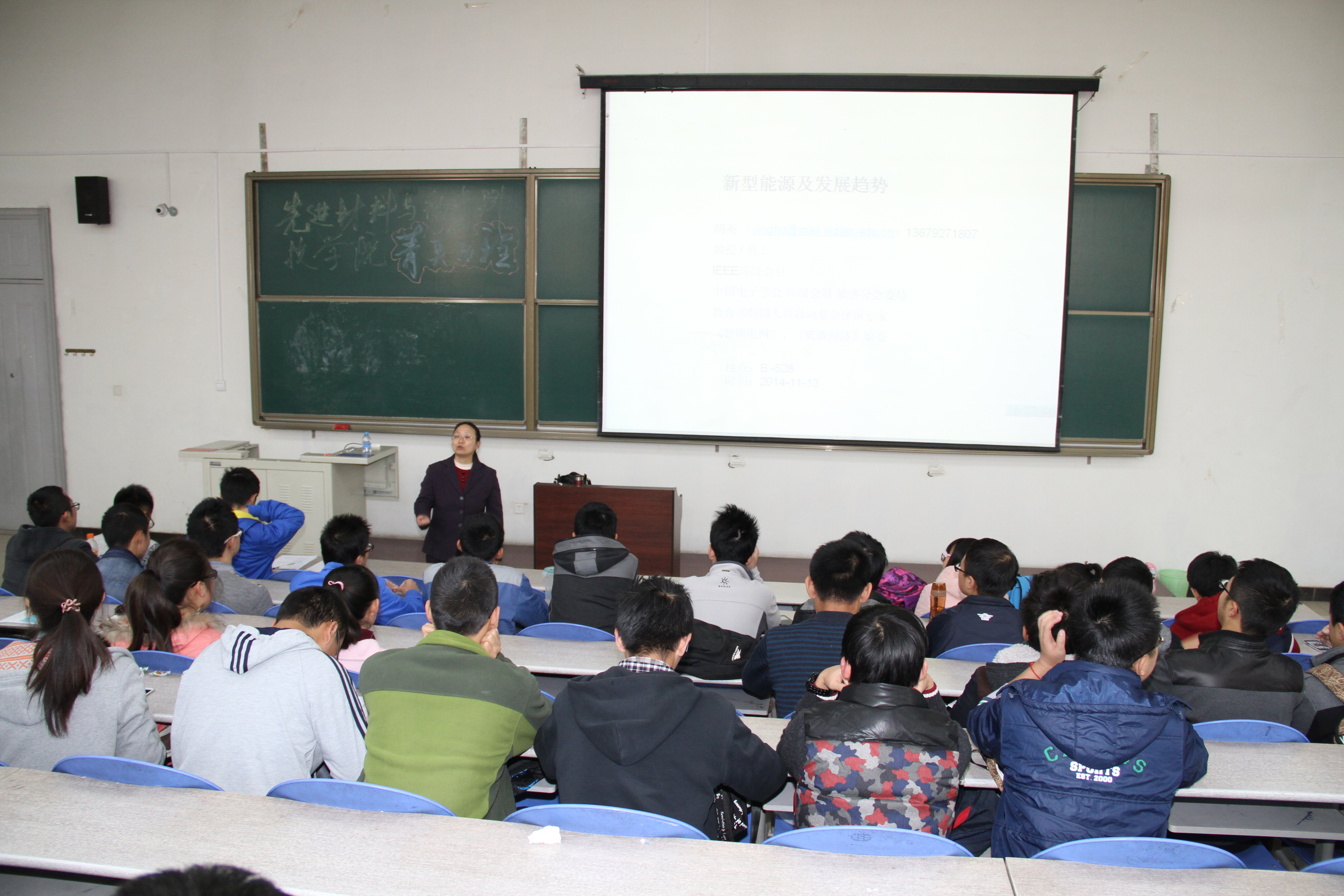 胡英教授主讲。首先,她形象生动地向大家介绍了当今世界面临的能源问题。接着,从全光谱光催化材料、太阳能电池、超级电容器、车用氧传感器四个主题展开,通过最新的科研进展,多方向、多角度介绍材料在能源领域中的应用。最后,她鼓励低年级学生认真学习基础课,在熟悉专业的同时为专业课的学习打下基础,并支持高年级同学进入实验室接触科研项目,在完成项目的过程中更加了解所学专业、不断提升自己的科研水平。