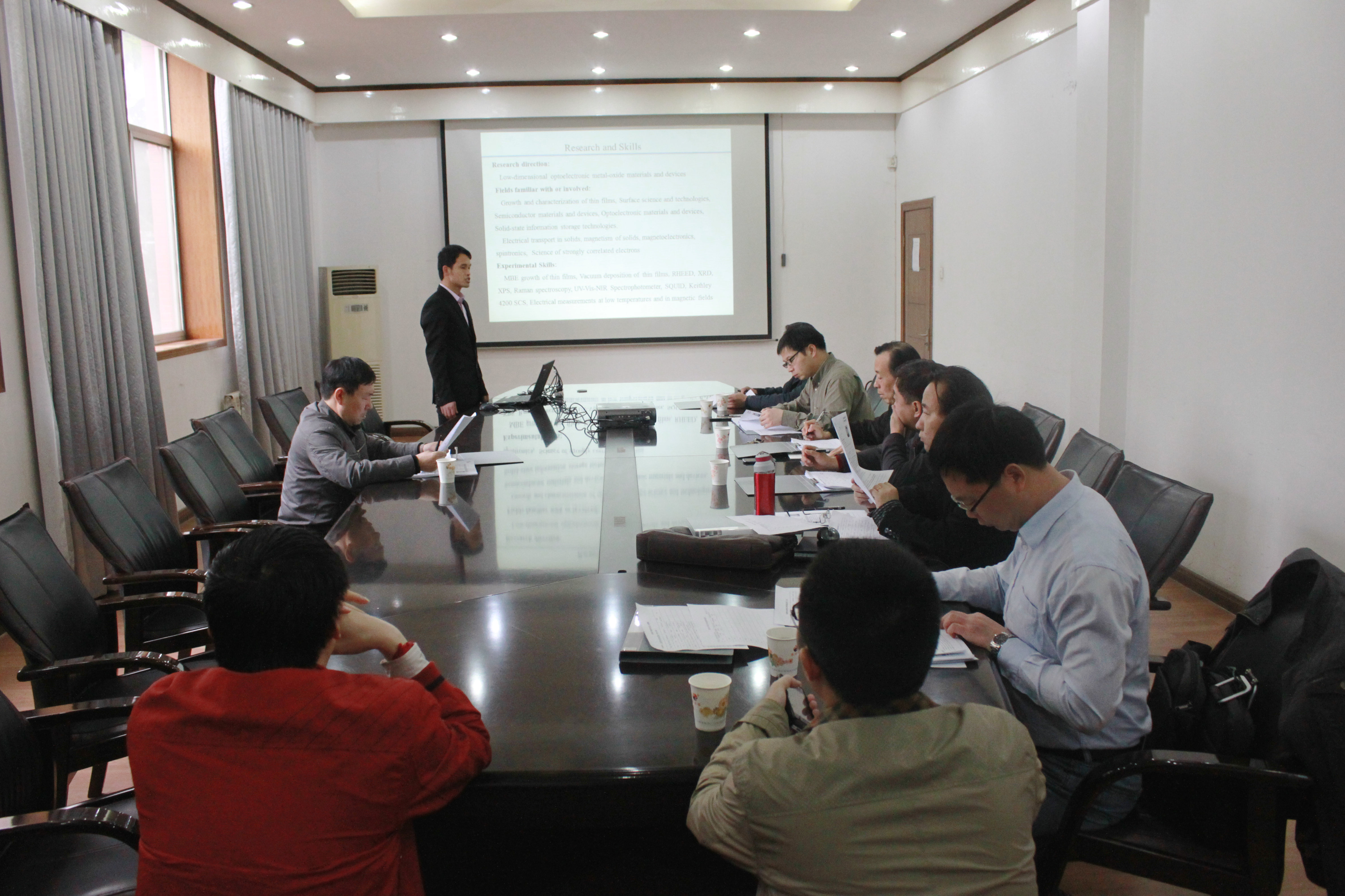 本次面试有来自全国各高校的9位博士参加,首先,每位博士都以PPT的形式将自己的个人简介、以往的科研工作以及对未来的设想作了较为详细的介绍,并针对具体问题与各位评委老师进行了交流与探讨。面试过程中,郝跃与各位教授针对WG电子