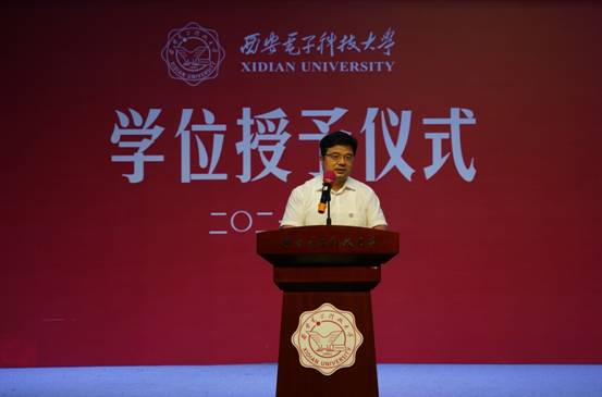 领导致辞。杨如森回顾了同学们在四年的奋斗与蜕变,尤其是肯定了在他们抗疫战斗、主动学习党史中所展现的家国情怀、责任担当等崇高品质。同时,他以我国航天事业突飞猛进发展为例,以航天事业中的杰出校友张荣桥、党蓉、杨宏的巨大贡献为榜样,发扬西电人“姓党·爱国·为民”的精神特质,鼓励同学们在科技强国的新征程中创新进取、奋发有为、不辱使命。