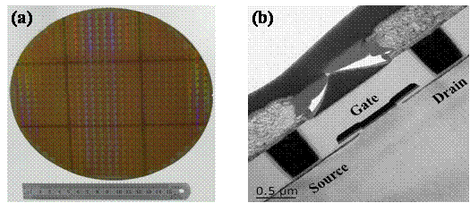 图3 (a) 8英寸氧化铪基铁电薄膜照片; (b) 后栅极工艺制备铁电存储单元照片