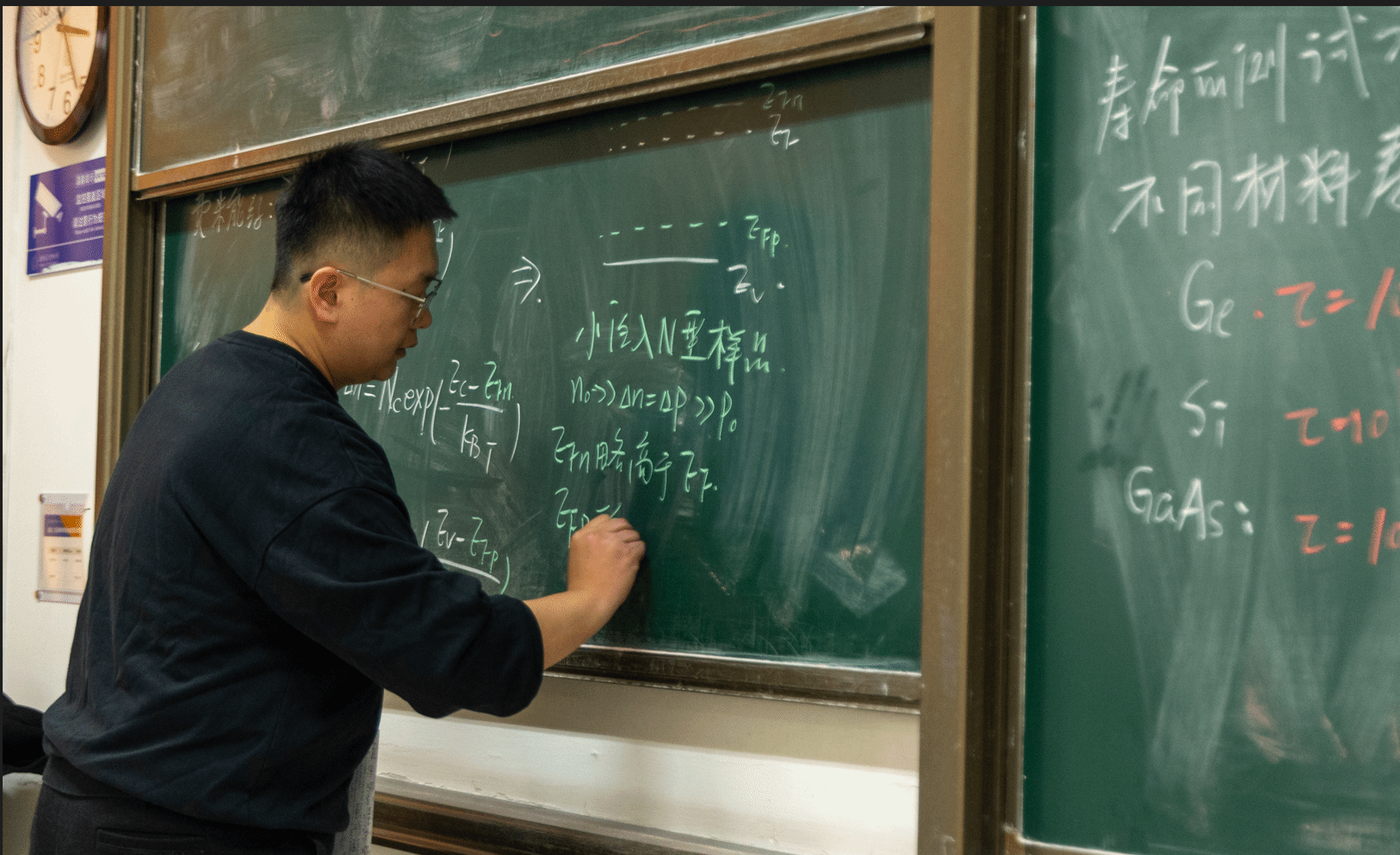 “作为一名教师,站稳讲台是首要任务。”为此,周龙一直向WG电子 的教学名师和前辈虚心求教,汲取教学经验和智慧。在担任助教期间,周龙参与了黄云霞老师省级精品课程《固体物理》的建设和学习,深刻体会到了教师站稳讲台的艰辛与不易。黄云霞老师认真负责的教学态度,以及“讲好课,育好人”的教学理念,深深地影响了他,成为他教学生涯中的宝贵财富。“目前,我主讲《固体物理》《半导体物理》《固体电子器件》课程,课程量不算多,因此每一次备课,我都会精心规划板书的内容,力求做到既简洁明了又生动有趣。” 在讲台上,周龙总是充满激情和活力,善用生动的例子和有趣的故事,来激发学生的学习兴趣和求知欲,让学生在学习过程中能够有所收获。课后,学生们也愿意主动找周老师请教问题,共同探讨学术难题。这种良好的师生关系不仅促进了学生的学习进步,也为学生今后的科研道路奠定了坚实的基础。