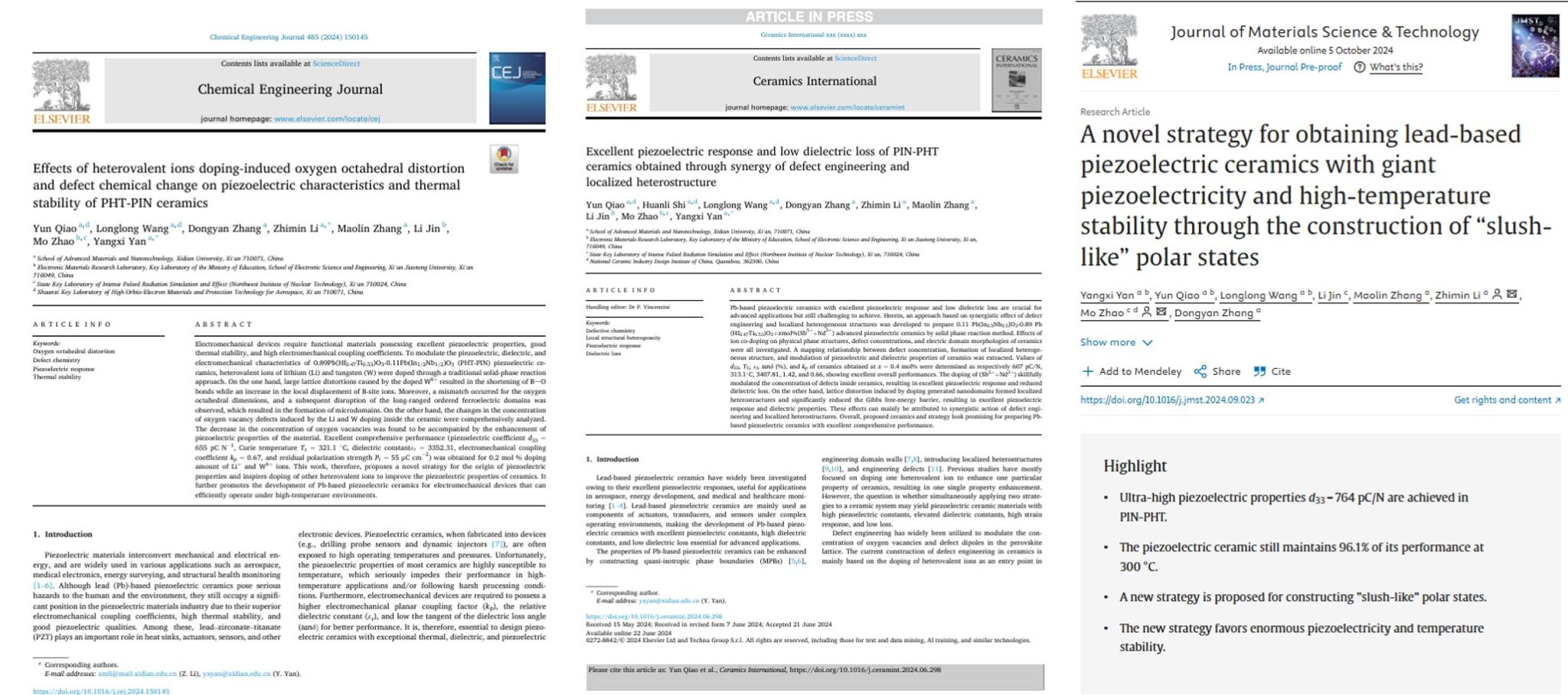 回顾这两年多的学习科研,谯云每周在实验室工作60余小时,在一次次的失败中总结经验;在晚上10点多的自习室里总有她的身影;经常和导师就文献中的问题进行讨论。围绕国家压电陶瓷领域的卡脖子问题,她努力学习专业知识,2023-2024学年综合排名位列专业第一;结合实际市场需求开展科研探索,并基于探索结果以学生一作在中科院一区、二区TOP期刊上发表SCI论文3篇(其中两篇一区TOP文章影响因子均达10以上),参与研究生创新基金1项,参与航空基金项目“用于智能弹药的压电陶瓷驱动器研究”,在理论和工程应用上实现了突破;她积极参加校企交流以及横向项目的攻坚工作,确保项目的平稳推进;多次参加高水平学术报告会,在耳濡目染中不断提升自身科研素养和解决问题的能力。谯云创新性地提出氧八面体晶格畸变后键长键角变化和“泥浆状”极性状态对PIN-PHT压电陶瓷微观结构、宏观电学性能的影响,制备出兼具超高压电性和优异温度稳定性的PIN-PHT高温压电陶瓷。基于以上实验突破,她以第一第二作者分别在在中科院一区TOP期刊Chemical Engineering Journal(IF=13.3)和Journal of Materials Science & Technology(IF=11.2)上发表2篇SCI论文。这项工作为开发同时兼备高压电响应高居里温度和优异温度稳定性的压电陶瓷提供了一条新思路,大大拓宽了PIN-PHT陶瓷的应用领域,有望推动压电陶瓷材料的应用进程。