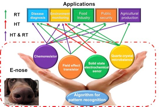 由于电子鼻(electronic noses)/人工嗅觉(artificial olfaction)在模拟人类嗅觉器官精确识别气体种类和浓度方面的潜力,自开展研发以来一直受到科学界和工业界的广泛关注。目前在环境监测、疾病诊断、公共安全、机器人、农业生产和食品工程领域具有广阔的应用前景。然而,与日臻成熟的人工视觉(光的波长与亮度的空间分布)、人工听觉(音高、音量和音色)、人工触觉(应力、应变等)不同,电子鼻/人工嗅觉由于待测气体通常具有所含气体种类复杂且浓度差异大、传感器输出信号(电阻/流或频率等)差别小等限制,在准确识别气味方面仍面临着巨大的挑战。