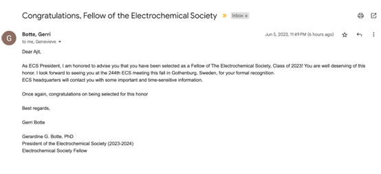 Ajit Khosla教授当选2023届美国电化学会会士(Fellow of the Electrochemical Society, ECS),并受邀参加今年秋季在瑞典哥德堡召开的第244届美国电化学会会议(244th ECS Meeting)。