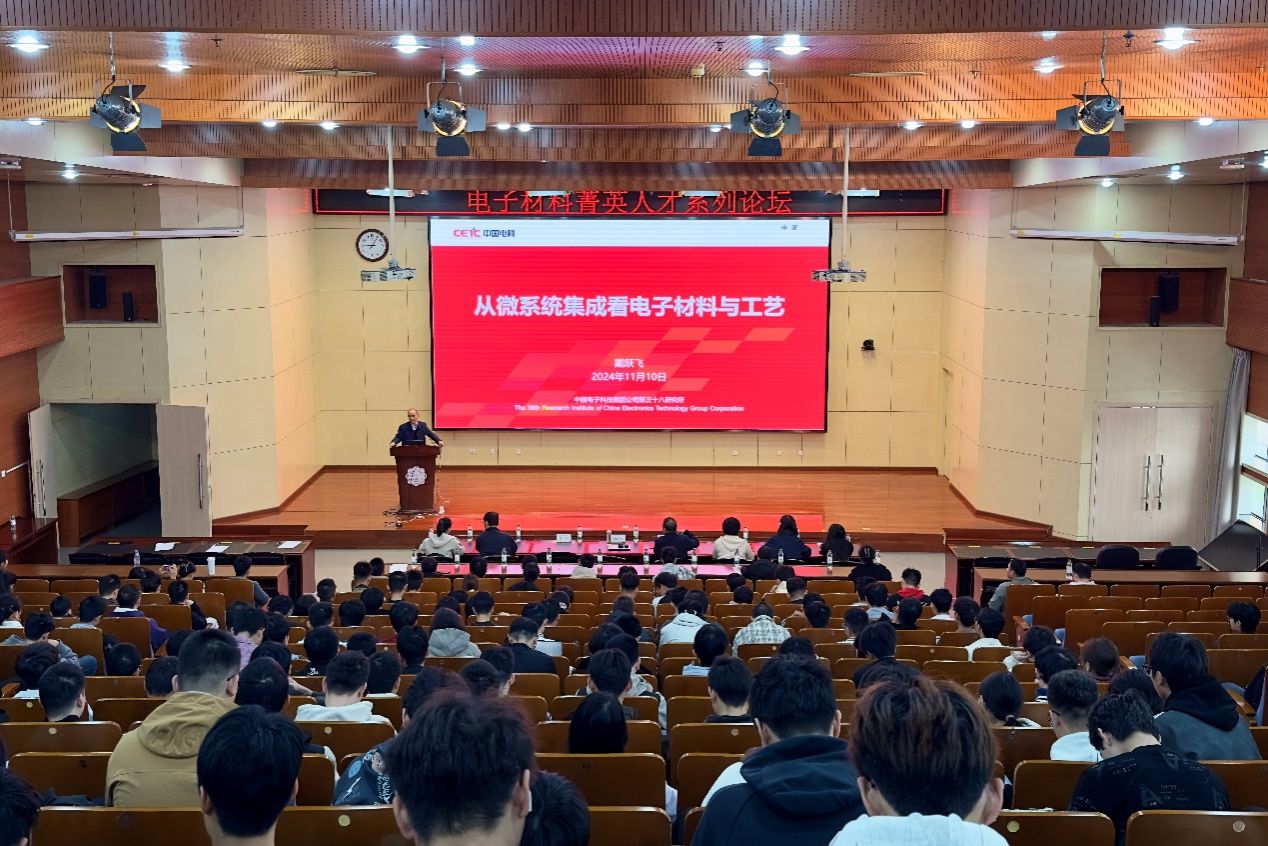 在南校区行政楼210报告厅举办了“电子材料菁英人才系列论坛”。受周益春教授邀请,中国电科首席专家、中国电科第38研究所副总工程师戴跃飞研究员以“从微系统集成看电子材料与工艺”为主题,带来了一场内容丰富、科学与工程结合紧密的学术报告。报告会由周益春教授主持,WG电子