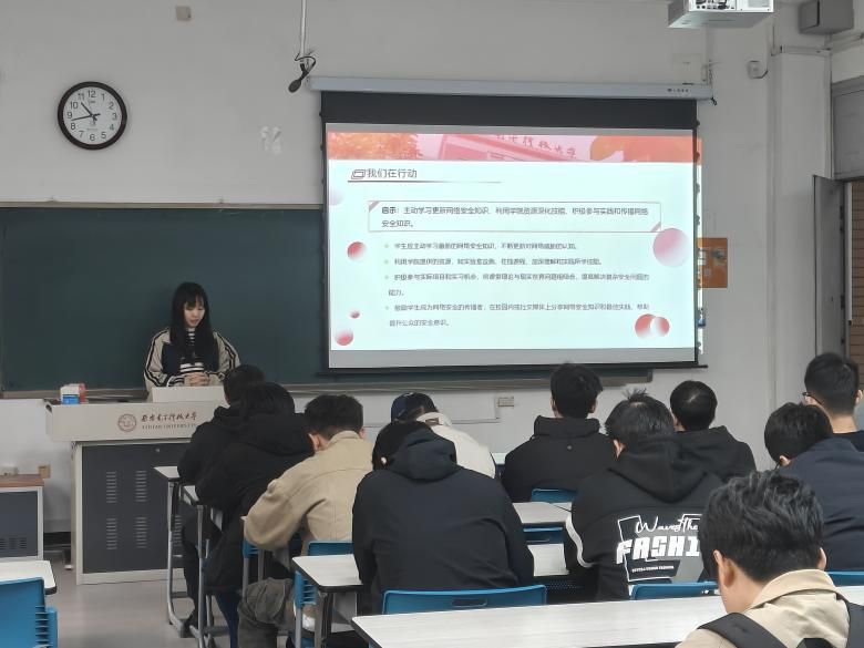 活动伊始,网信院朱芸慧同学围绕“网络安全为人民,网络安全靠人民”展开宣讲。她结合当前网络空间的发展态势与典型案例,深入浅出地阐述网络安全的重要性,号召党员同志们主动学习网络安全知识,提升防范意识与防护能力。朱芸慧强调,维护网络安全不仅是技术问题,更是每一位青年党员的责任与使命。她的讲解内容详实、贴近实际,引发在场同学的广泛共鸣。