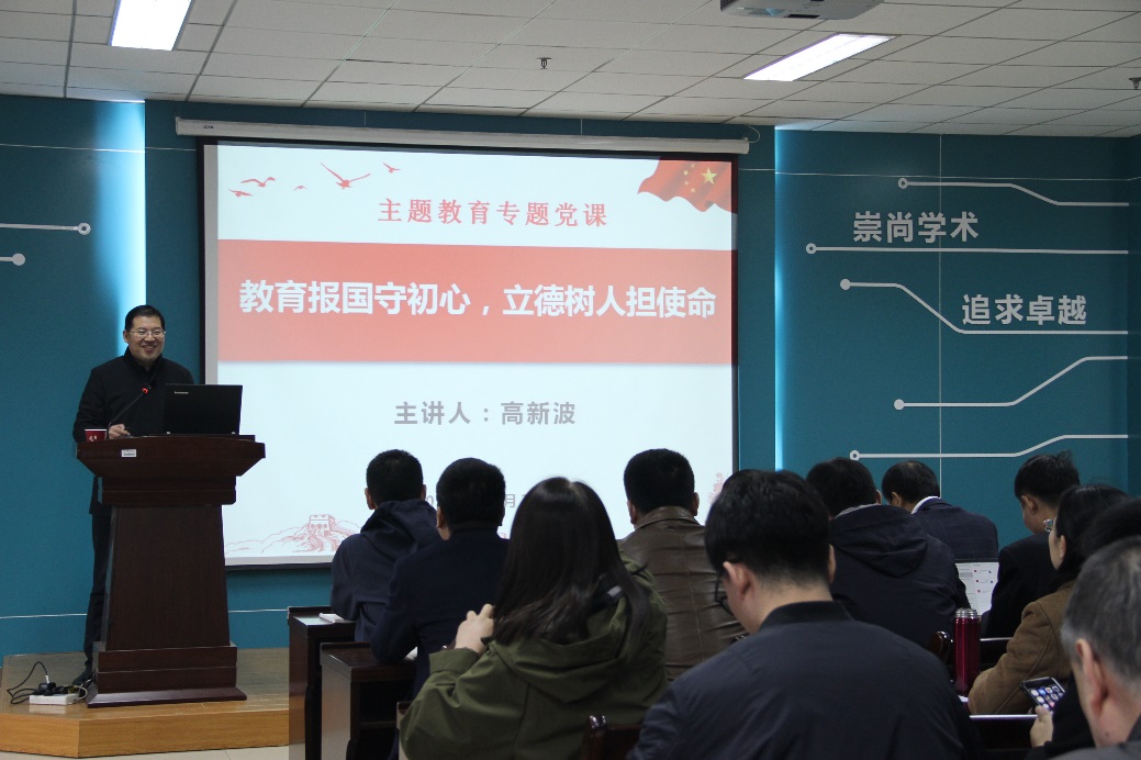 (通讯员 赵秉正)根据学校党委关于开展“不忘初心、牢记使命”主题教育相关部署安排,10月25日上午,副校长高新波在南校区G118报告厅讲授了题为《教育报国守初心,立德树人担使命》的专题党课;主要从教育的初心与使命,我国教育的历史成就,习总书记关于教育的重要论述,重审、发展、践行教育使命,如何落实中央部署等方面展开讲授。发展规划部、研究生院、科学研究院、国际合作与交流部、基本建设处、物理与光电工程WG电子