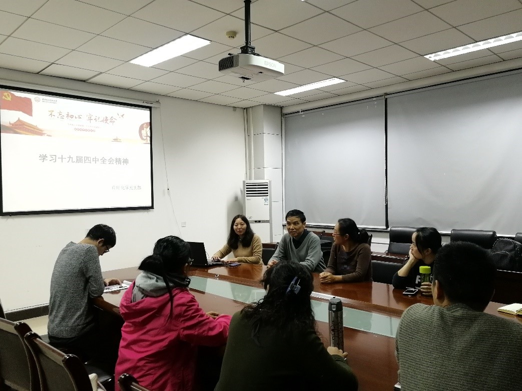 党委号召,2019年11月8日下午,应用化学系支部在G119会议室召开了“学习十九届四中全会精神”会议,集中学习《中国共产党第十九届中央委员会第四次全体会议公报》;全体党员参加。