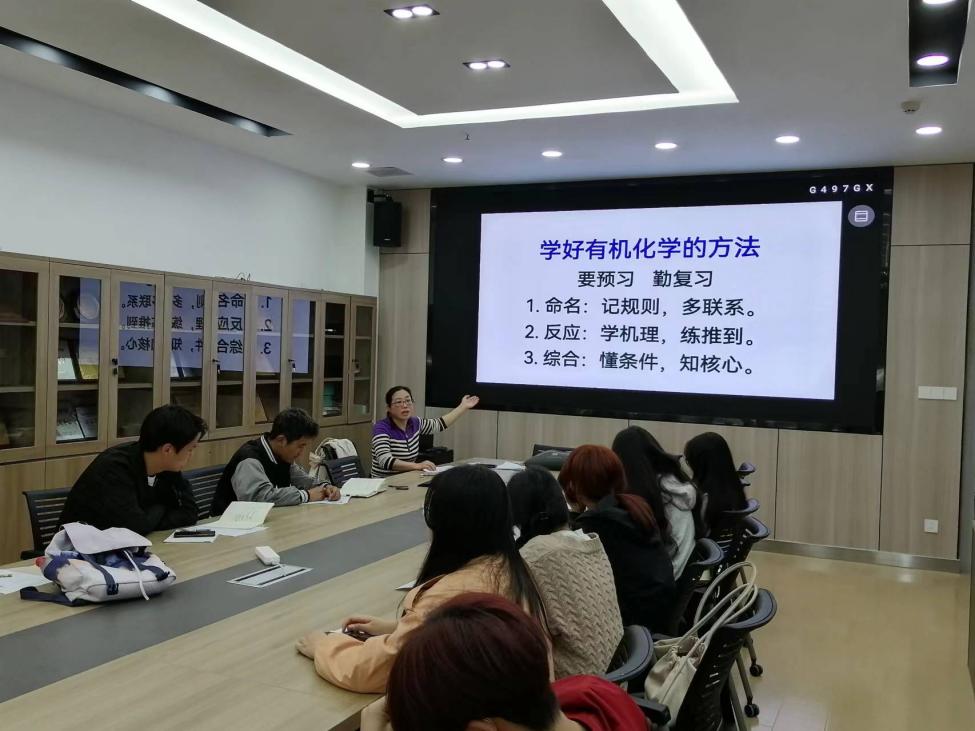 在座谈中,大家积极讨论如何提高学习效果、重视课堂学习,以及解决问题切入点等内容,周利君老师指出,快速高效学习有机化学的方法,就是要:跟上脚步勤复习,理解联系找规律,她还详细讲解了典型有机化学题型,通过具体分析,指导大家如何思考并做出正确判断。两位学习优秀、测试满分同学分享了学习经验,张同学说:"有机化学课堂占80%,课堂认真听讲非常重要,我每次听讲都坐第一排,课后做作业巩固,考试就胸有成竹",谷同学分享到:"在有机化学学习过程中,除上课认真听讲外,课后有空时,我会看视频,周老师每个视频都按照主题或者反应类型剪辑,能很快找到自己需要学的那部分,效率大大提高。"在热烈讨论中,帮扶活动达到高潮。