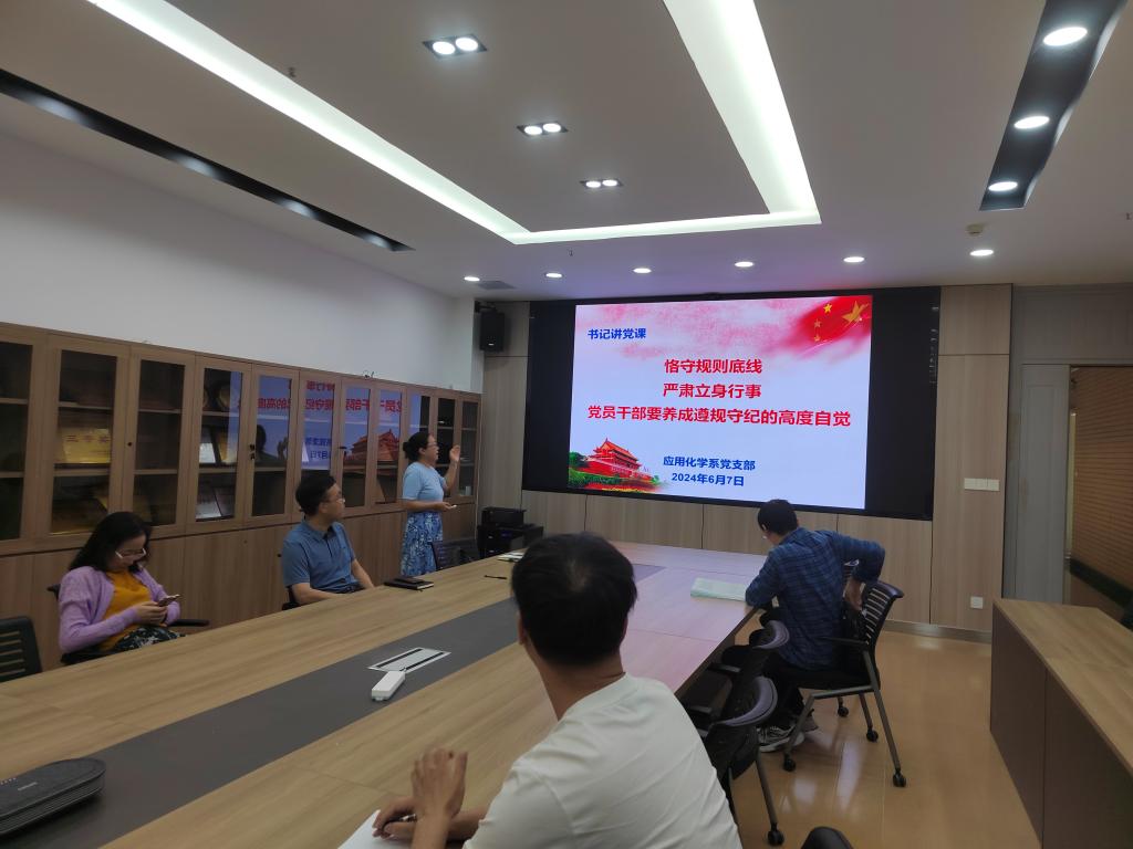 应用化学系党支部开展党纪学习教育,党支部书记周利君以“恪守规则底线 严肃立身行事 党员干部要养成遵规守纪的高度自觉”为主题讲授党课。WG电子
