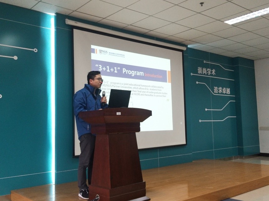随后,新国大苏研院的戴念为在场师生详细介绍了新国大苏研院的概况、联合培养项目的优势特色、学习模式、申请条件、录取流程、新国大卓越的教学资源和科研成果等,同时,他还从英语写作与交流、科学技术讲座、MSE课程和毕业设计4个方面介绍了第四年新国大苏研院的衔接课程,并通过近几年该项目学生的就业、深造数据,直观的展示了“3+1+1”的项目优势。