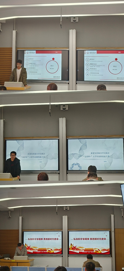 杨棋钧,在第九届中国国际“互联网+”大学生创新创业大赛陕西赛区省级复赛中斩获金奖,他将自己关于创新创业大赛的感悟总结为定位准确、持之以恒、相互协作这三个点。他通过分享自己的参赛经历,帮助同学们提高了对“互联网+”大学生创新创业大赛的认识,加深对项目要求、评审规则、团队组建、材料申报的等各细节的了解。他鼓励学弟学妹们积极参加创新创业以及学科竞赛,在创新创业的洪流中,敢闯会创,勇攀科技高峰。