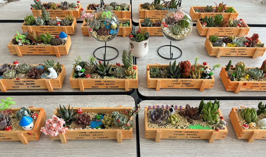 随后,经过同学们的一双双巧手,一个个独具特色的多肉DIY作品应运而生。简单的多肉变成了一件件精美的艺术品,经过一番精心插种与设计,在可爱花盆与精巧小摆件的搭配下,小巧玲珑的多肉植物更是增添了一份萌趣与可爱,焕发出勃勃生机,让人爱不释手。这些作品无不展现出了同学们的创意与匠心,审美与想象。