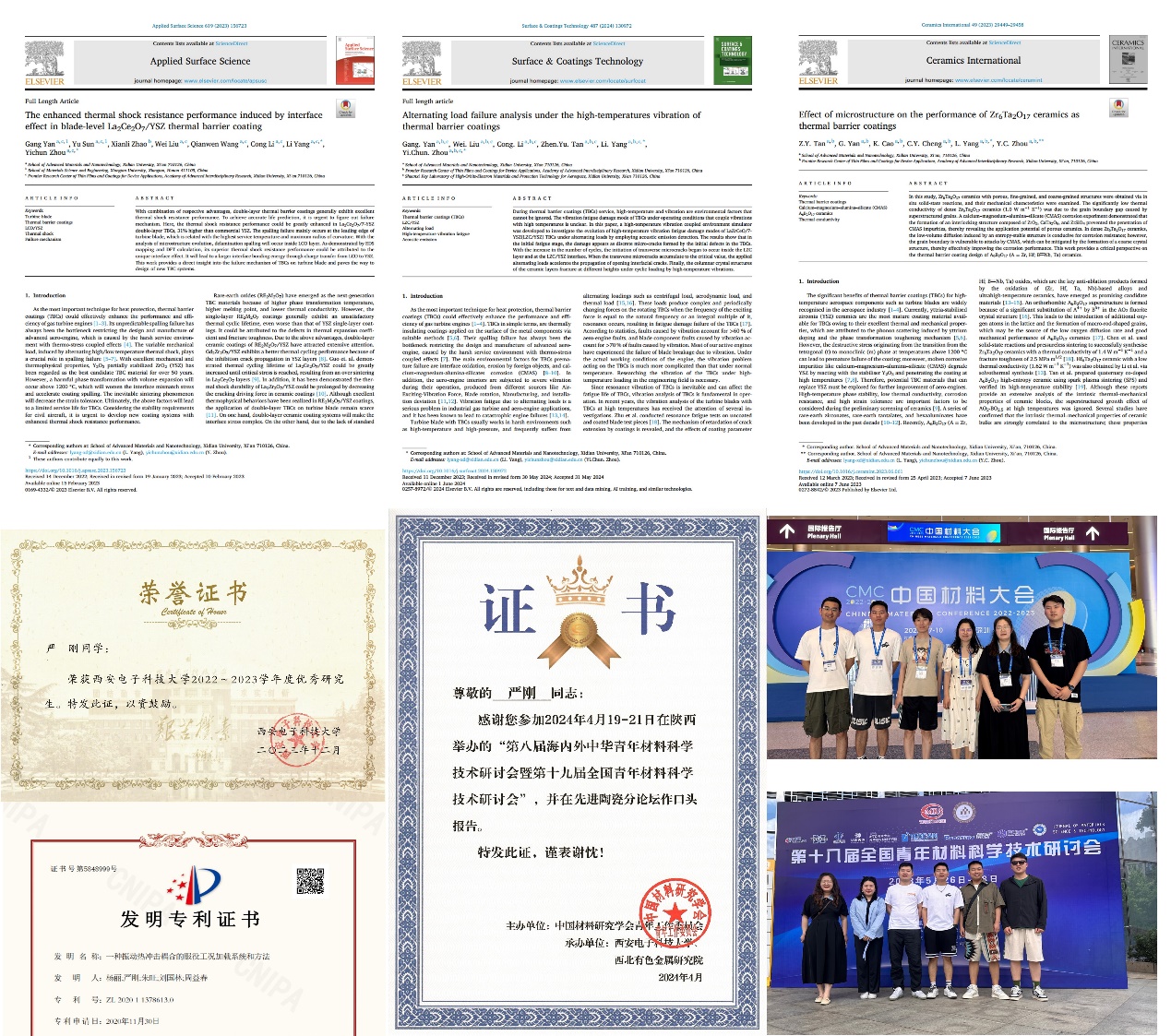 暮春初夏时分,夭夭桃花已不再灼灼其华,但少年寻梦的山海旷野依旧青绿。自从进入研究生阶段以来,严刚展现出了非凡的科研潜力,用热血和激情点燃了自己的科研之路,用坚韧和智慧攀登着科学的高峰。他的研究方向是热障涂层热力化极端环境模拟与损伤检测,虽然这一前沿领域充满着无尽挑战,但他始终以饱满的热情和顽强的毅力投入其中。科研旅途,荆棘丛生,科研过程中的他也遇到了无数的困难和挫折,实验数据的波动、实验设备的故障、理论模型的推翻,这些都曾让他感到困惑与压力。面对困难,他从未放弃,总是以积极的态度面对每一个问题,努力寻找解决的办法。他常常在实验室里通宵达旦,不断地开展实验、分析数据、调整方案。在导师的指导下,他在短短的几年内取得了显著的科研成果。他先后以第一作者或共同作者在Applied Surface Science、Surface and Coatings Technology 、Ceramics International等国际知名期刊上发表多篇高质量论文,获得授权国家发明专利2项。多次参加中国稀土大会、全国青年材料科学技术研讨会、全国力学博士生学术论坛等国内会议并做口头报告,在中国材料大会等会议进行墙报交流,了解科研前沿动态,开拓科研新思路。